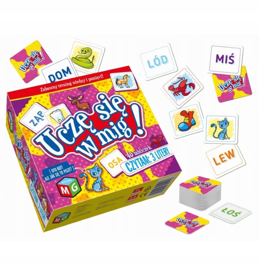 UCZĘ SIĘ W MIG - CZYTAM: 3 LITERY” to wspaniała gra, która rozwinie pamięć i spostrzegawczość Twojego dziecka. Dodatkowo pomoże mu w nauce czytania na podstawie 3-literowych wyrazów, zapewniając przy tym dużo dobrej zabawy i emocji. W grze wygrywa ten, kto najlepiej zapamięta położenie par ilustracji i trzyliterowych wyrazów, odkrytych na chwilę, spośród wszystkich ilustrowanych tabliczek leżących na stole rewersem do góry.
