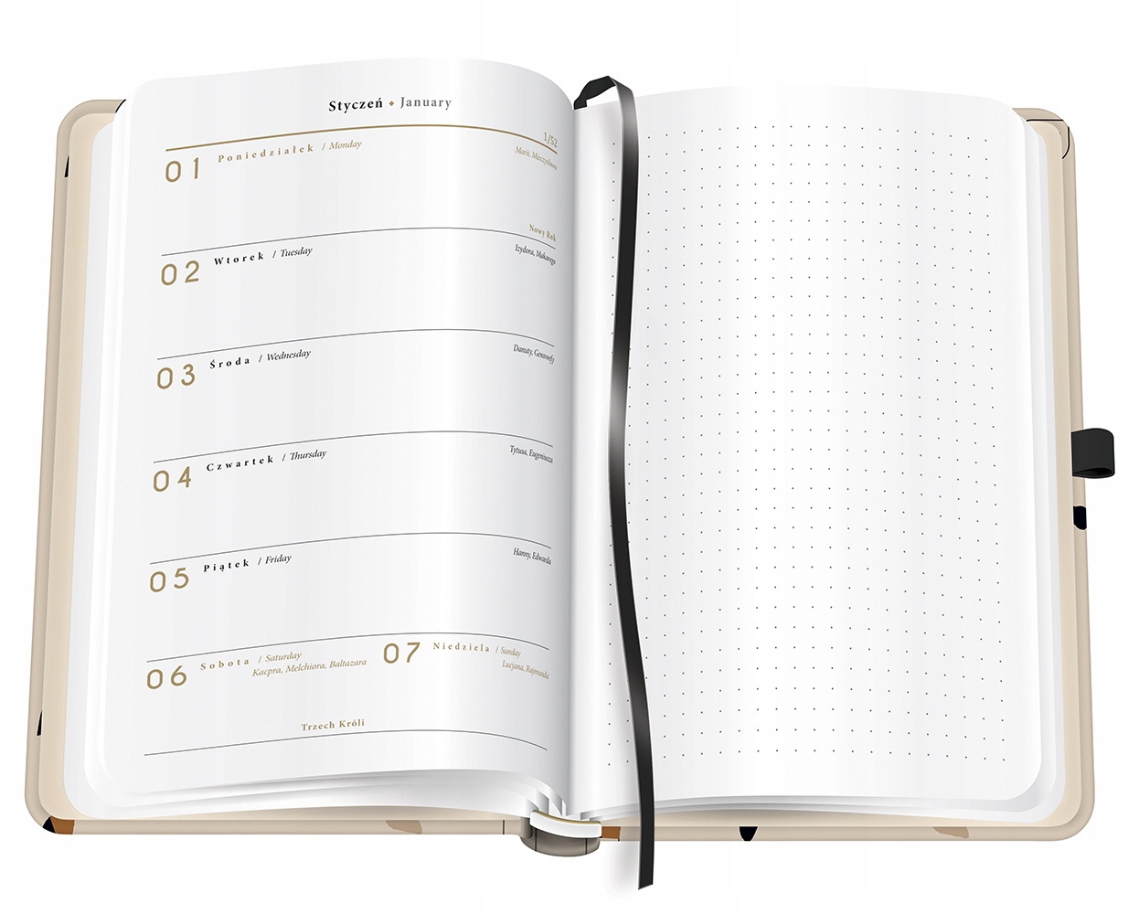 Kalendarz książkowy tygodniowy. Twarda oprawa skutecznie chroni zawartość przed zniszczeniem, elastyczna gumka chroni luźne notatki przed wypadnięciem. Idealny do szkoły oraz pracy.