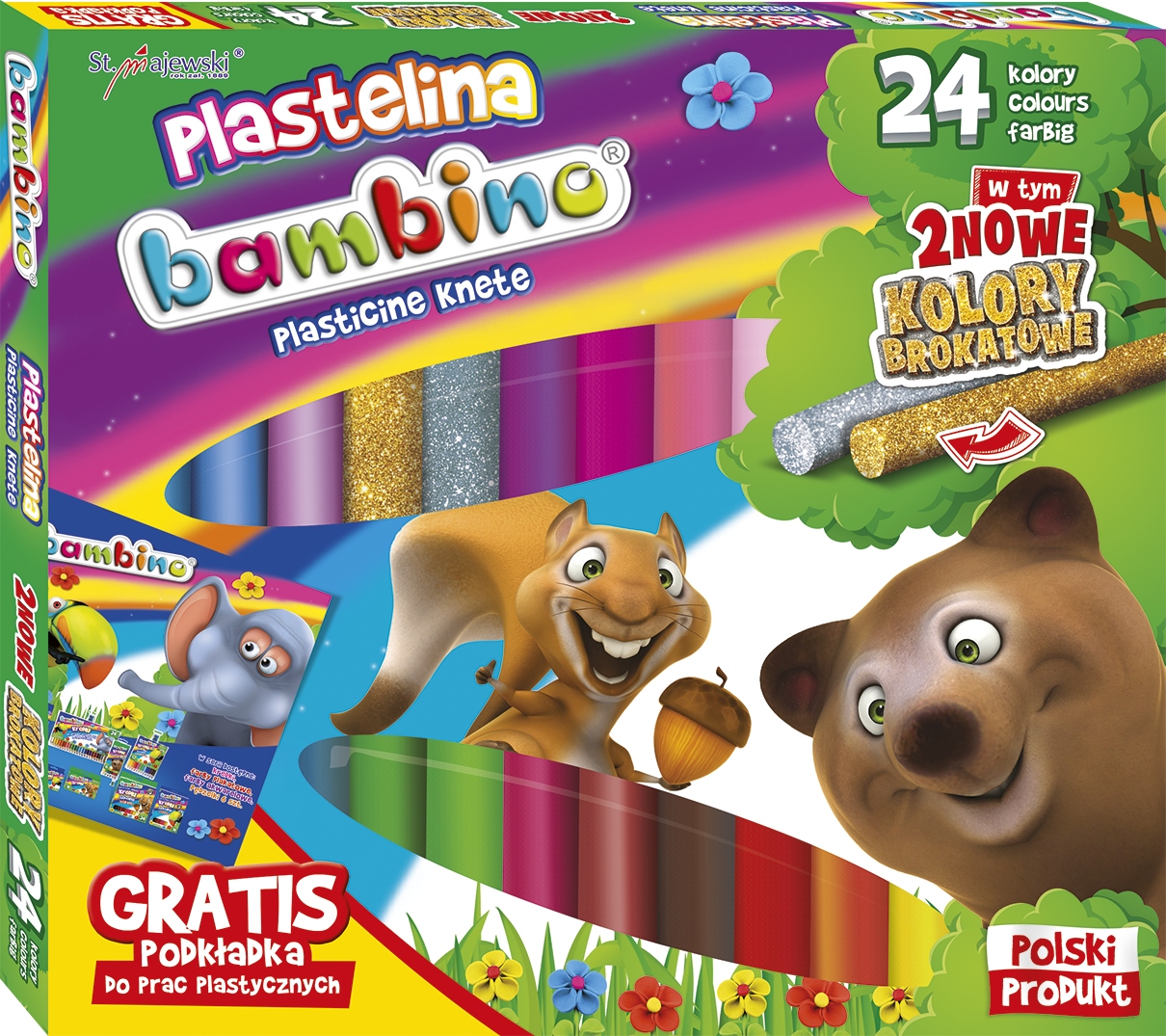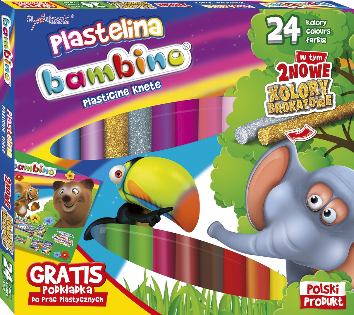 Plastelina Bambino to wysokiej jakości masa plastyczna. Jest elastyczna, nie brudzi rąk, nie przywiera do podłoża, łatwo się modeluje, pozwala na tworzenie prac metodą millefiori. Nie wysycha na powietrzu, przez co może być wykorzystywana wielokrotnie. Gama kolorów jest szeroka, barwy żywe, nasycone. Opakowanie zawiera dwa nowe kolory brokatowe - srebrny i złoty.