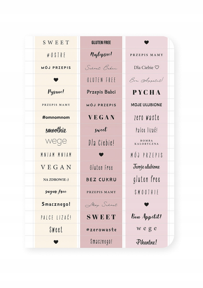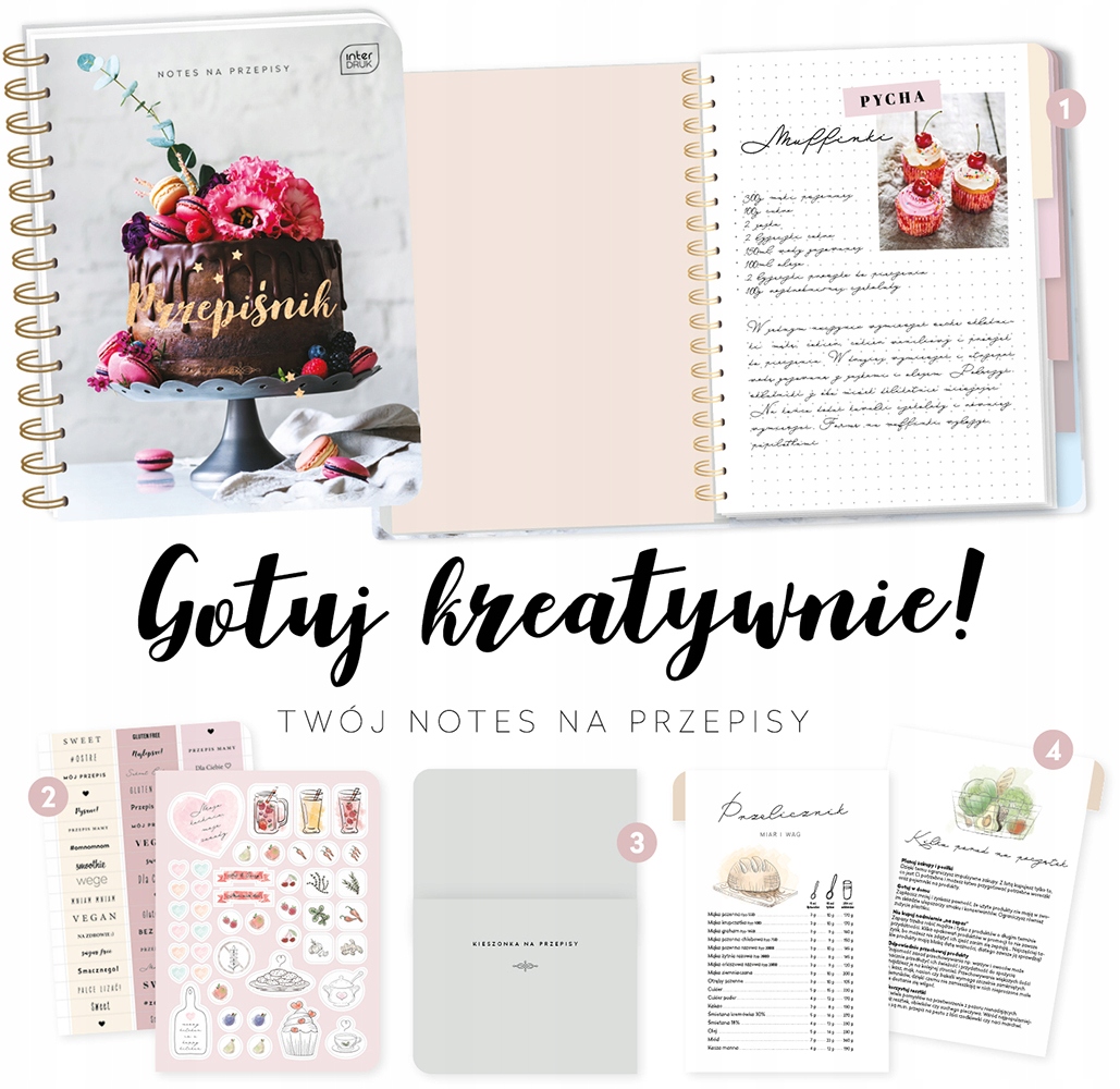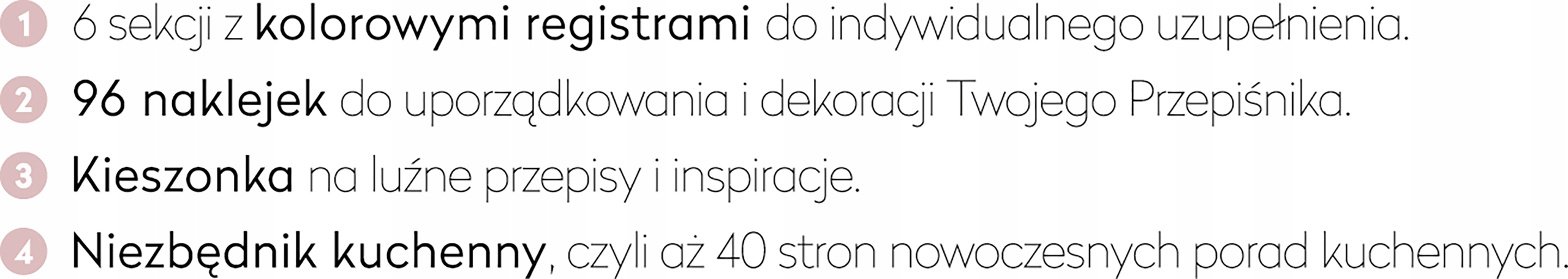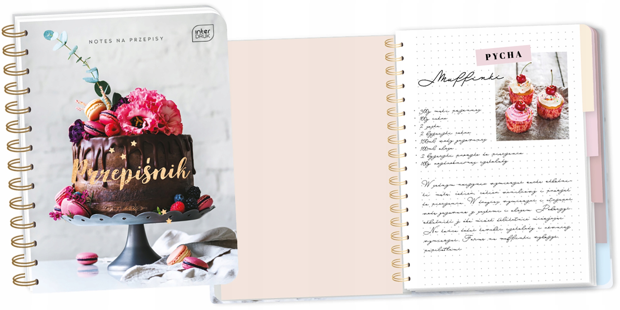Stylowy i funkcjonalny przepiśnik, dla pasjonatów gotowania i nie tylko, doskonały do gromadzenia ulubionych lub autorskich przepisów. Wewnątrz wyposażony w 6 sekcji z kolorowymi registrami oraz kieszonki na luźne zapiski. Kartki łączone przy pomocy spirali pozwalającej na wygodne wertowanie kartek. Całość otoczona stylową twardą okładką, zamykaną przy pomocy gumki.